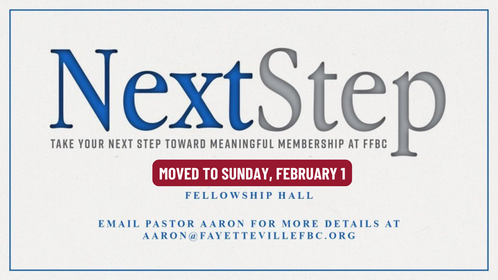 Would you like to make Fayetteville First Baptist Church your church home? Then we would like to invite you to attend our Next Step Class which is your next step towards church membership. The Class will be offered on Sunday morning, February 1 at 9:45 AM. Fill out the inquiry below if you would like to register for the class.