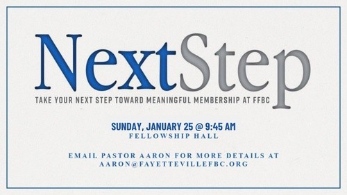 Would you like to make Fayetteville First Baptist Church your church home? Then we would like to invite you to attend our Next Step Class which is your next step towards church membership. The Class will be offered on Sunday morning, January 25 at 9:45 AM in the Fellowship Hall. Fill out the inquiry below if you would like to register for the class.